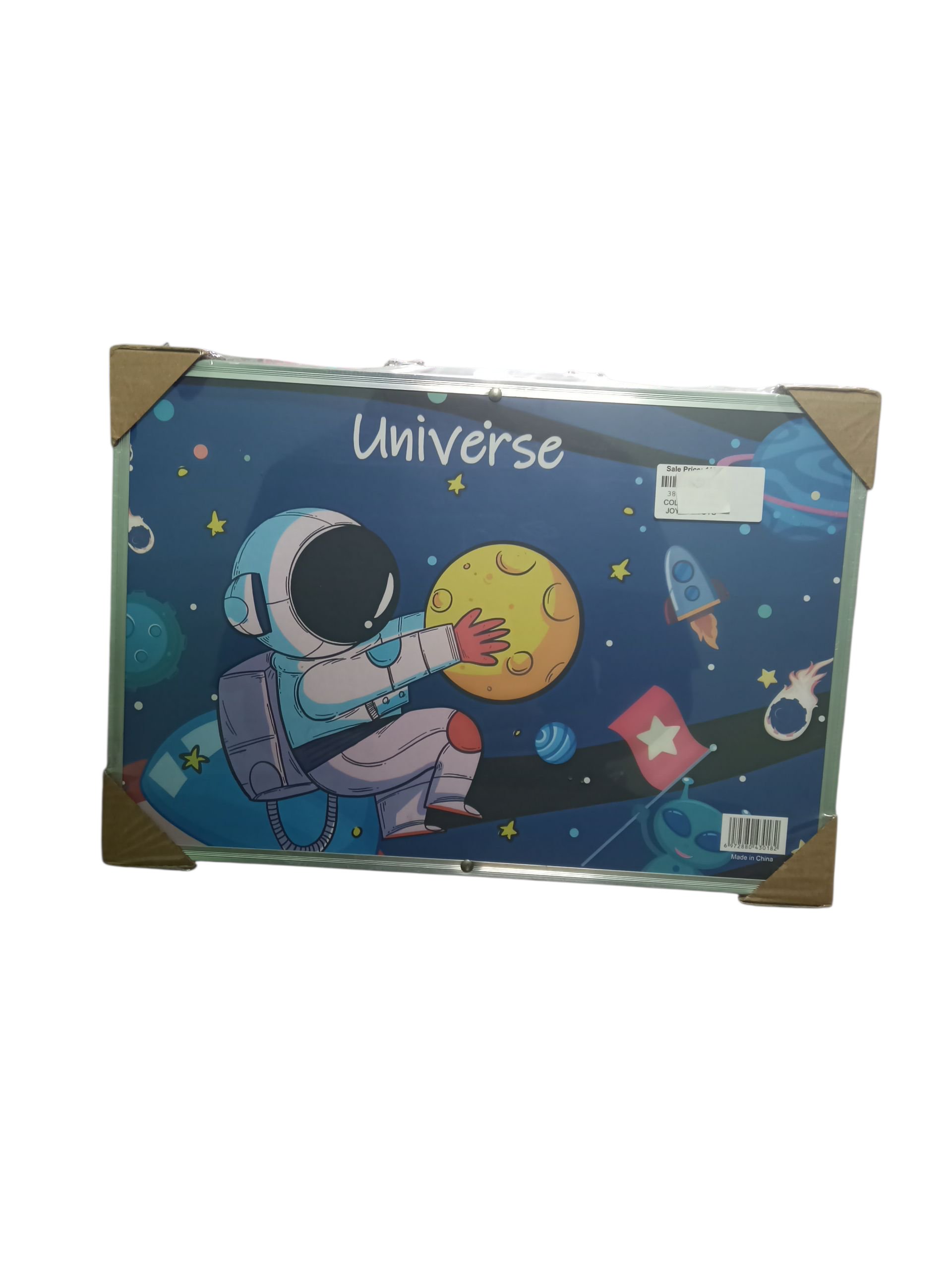 large, rectangular board with a vibrant, illustrated “Universe” or space theme. The artwork features an astronaut sitting on a rocket, holding the moon, surrounded by stars and planets. This is likely a magnetic whiteboard, chalkboard, or drawing board designed for children.
