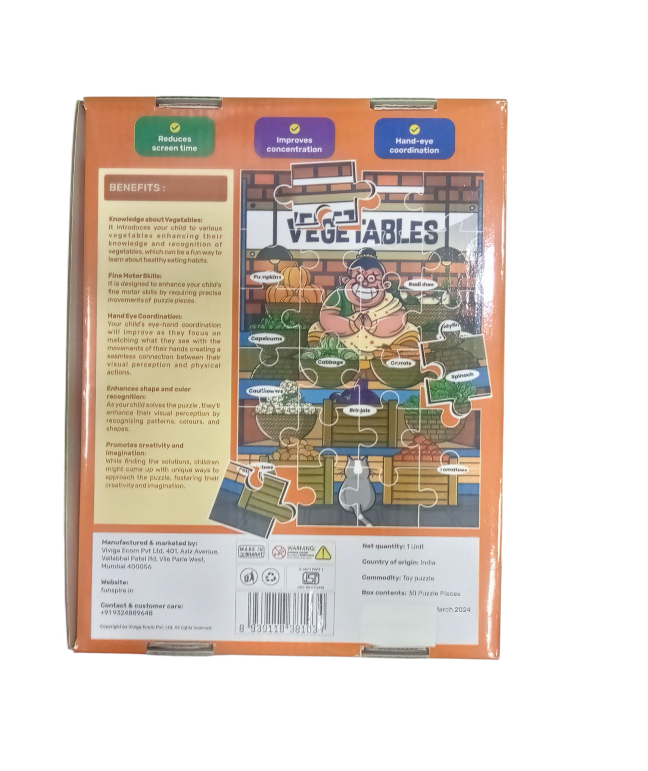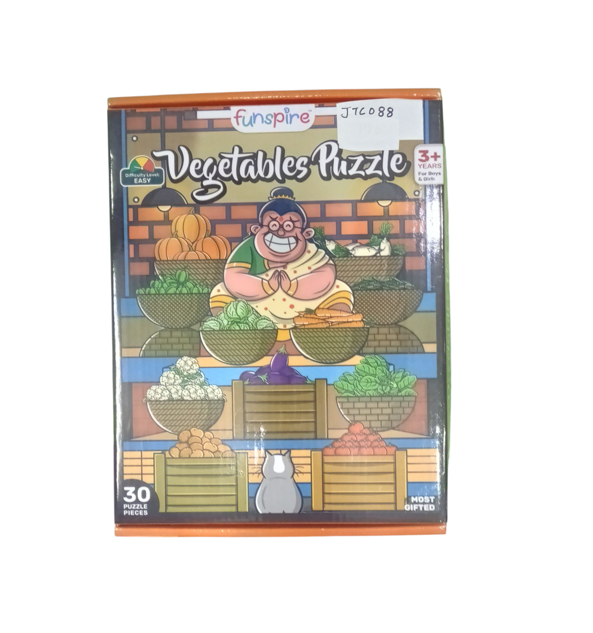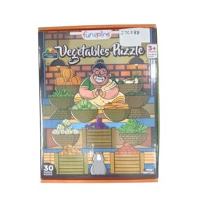 A 30-piece jigsaw puzzle designed for children aged 3+, showcasing a cheerful vegetable vendor and a vibrant market scene. Perfect for early learning, it helps kids improve problem-solving skills, hand-eye coordination, and recognition of different vegetables.