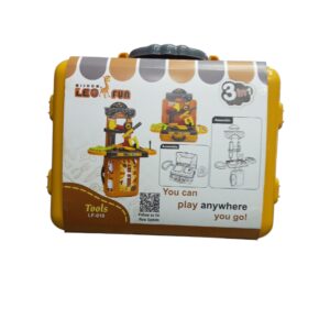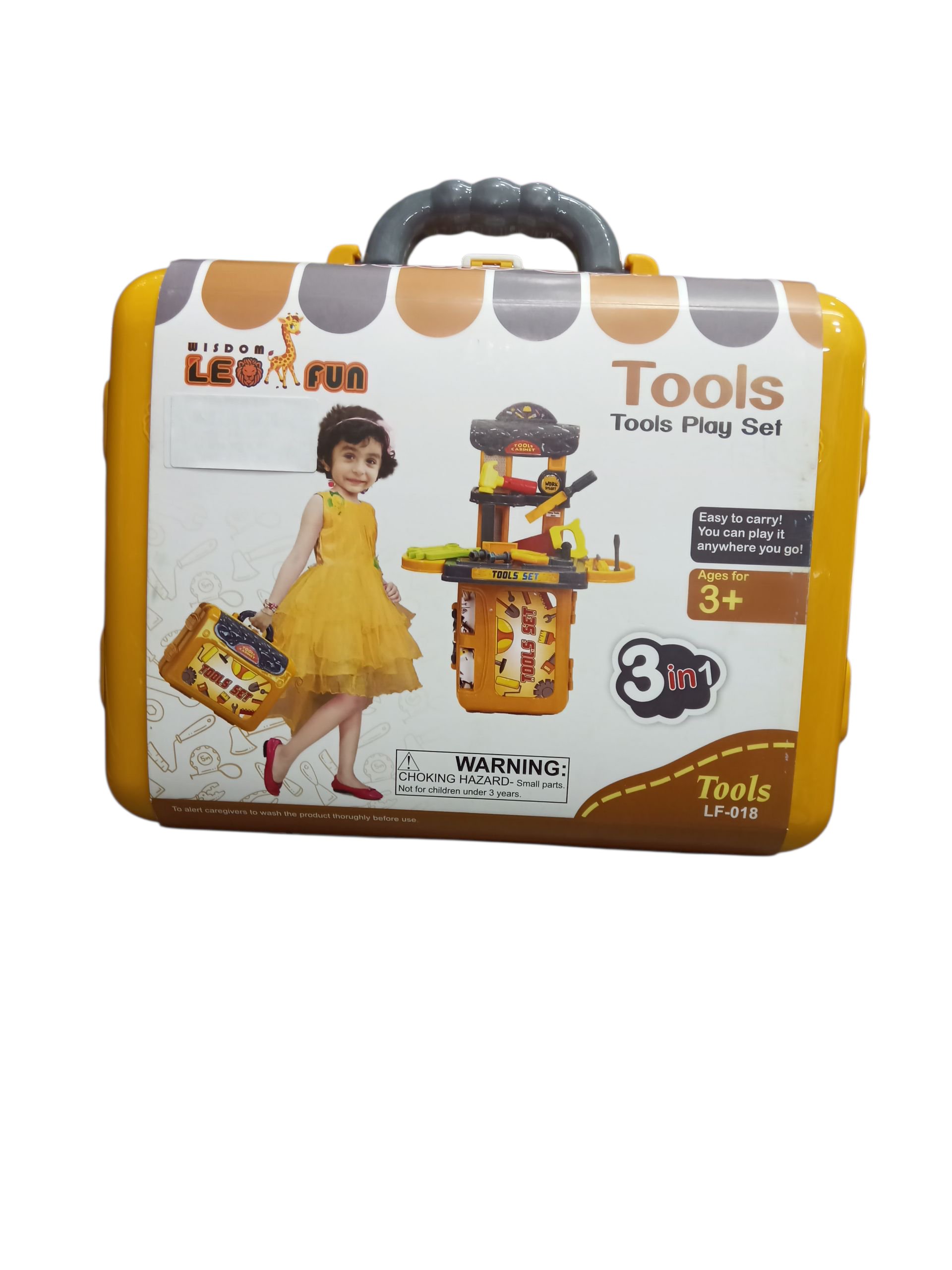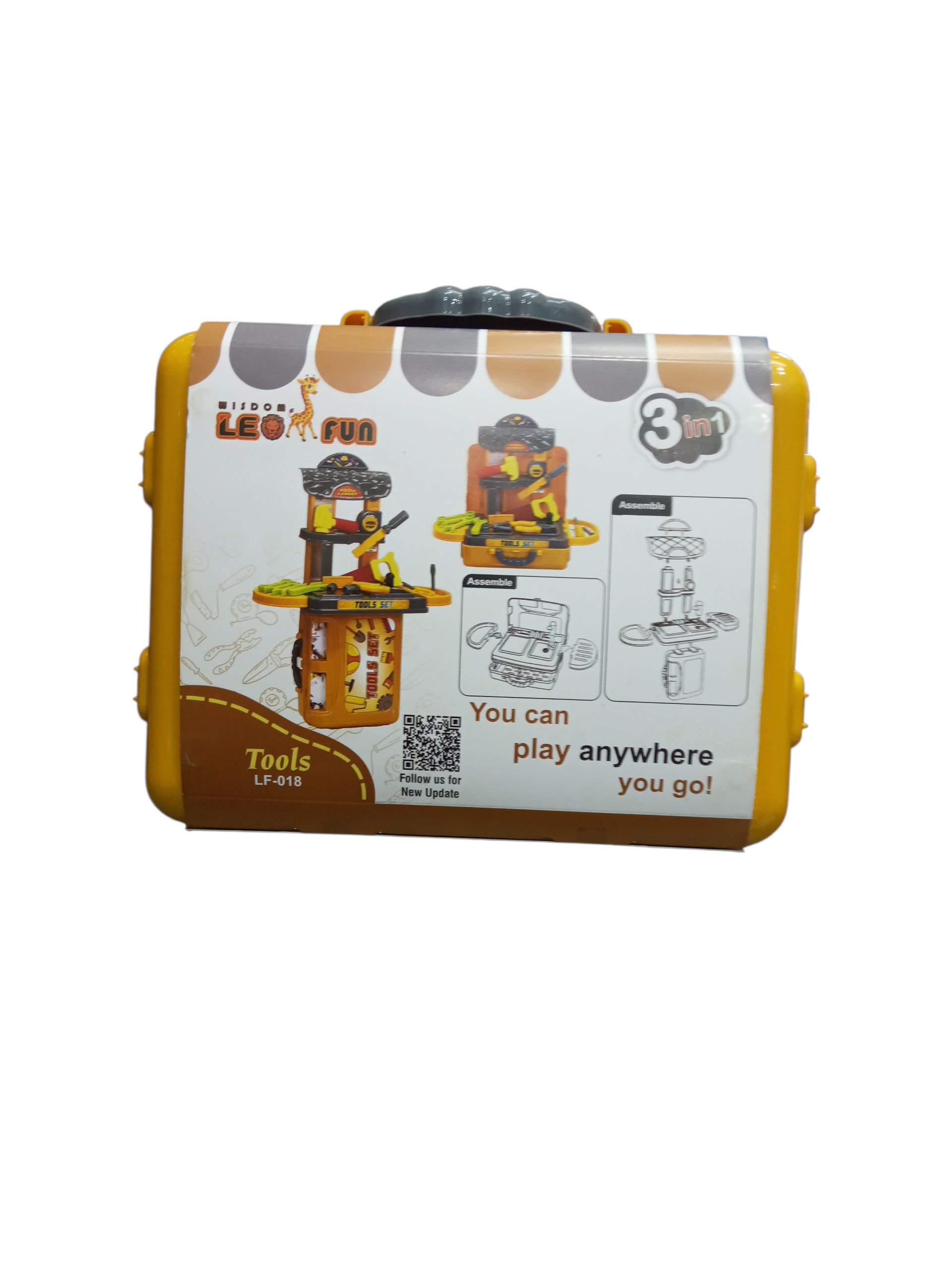 This is a Tools Play Set that is packaged in a yellow, portable suitcase. The box indicates it is a “Tools Play Set” and a “3 in 1” product designed to be “Easy to carry! You can play it anywhere you go!” It includes a miniature, collapsible workbench/tool station and is also branded as “Lega Fun,” recommended for Ages 3+.